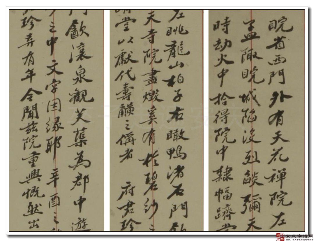 安徽博物院收藏的一幅邓传密(邓石如之子)书法作品题识中,发现了一段关于邓石如与安庆天花禅院的记载,内容是《荀子·劝学篇》,在最后一屏正文后,书有三列题识,如下:皖省西门外有天花禅院,左眺龙山、柏子,右瞰鸭渚、石门,饮瀼泉,观芙蕖,为郡中游览胜地。先君子乡城往来寓此,盖数十年。颜其厅事曰:‘裁云补衲之庐’,为书大幅篆、隶各一于壁,后之好古君子多于此访寻遗迹焉。癸丑孟陬,皖城陷没,烈焰弥天,寺院尽毁,奚有于碧纱之中文字因缘耶?辛酉之秋,湘乡相国毅勇侯、威毅伯昆仲戡平乱虐,慎简贤良,乃得我善征先生明府君摄宰是邦,出水火之民,登衽席之上,其年竟有能于当时劫火中,拾得院中隶幅,跻堂以献代寿觥之称者。府君珍弆有年,今闻兹院重兴,慨然出之,俾刻之,裁云庐壁返珠,还去思之情,岂有既乎?因书此奉呈,匪敢云报,聊永矢高谊于弗谖耳。同治戊辰立冬后二日,皖山遗民邓传密并识,时年七十有四。